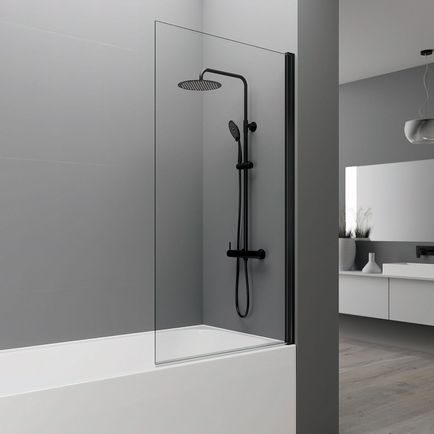 Los paneles Open incorporan el práctico y novedoso sistema de elevación al girar para salvar la bañera y evitar dañar el vierteaguas. Esta disponible en cristal transparente o serigrafía Frost Plús.